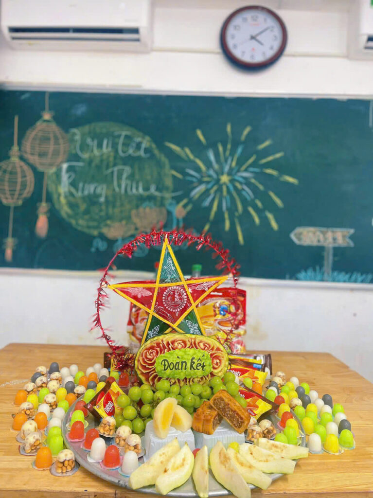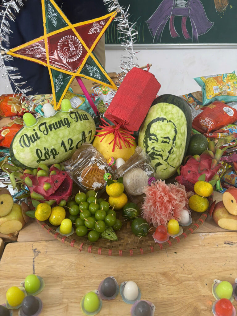 Bánh nướng, bánh dẻo, hoa quả và đèn lồng được bày biện công phu, sáng tạo, thể hiện sự khéo léo, tỉ mỉ và tinh thần đoàn kết của HSSV toàn trường.